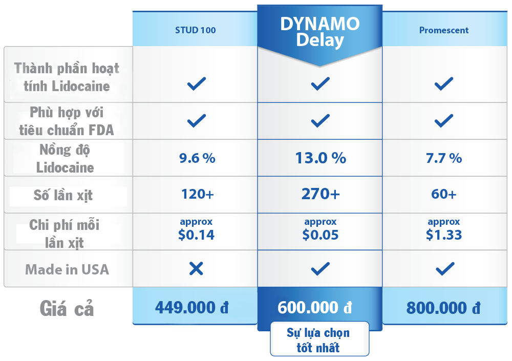 Tất cả những chai xịt này đều mang công dụng kéo dài thời gian quan hệ nhưng nổi trội nhất là chai xịt Dynamo Delay của Hoa Kỳ vì: